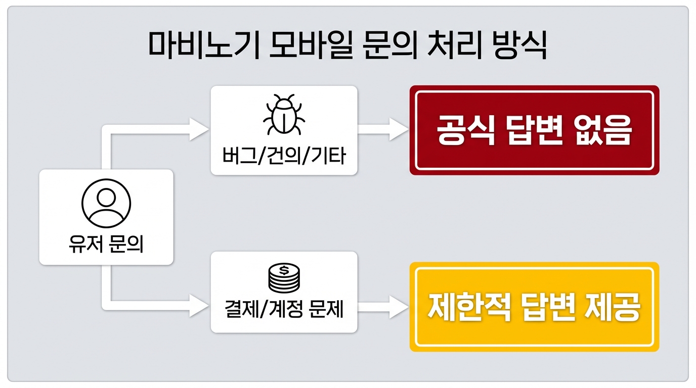 - 소통 창구 차단: 넥슨은 마비노기 모바일에서 결제/계정 관련 문의를 제외한 모든 일반 문의에 대해 공식적으로 답변하지 않는 정책을 고수하고 있습니다.