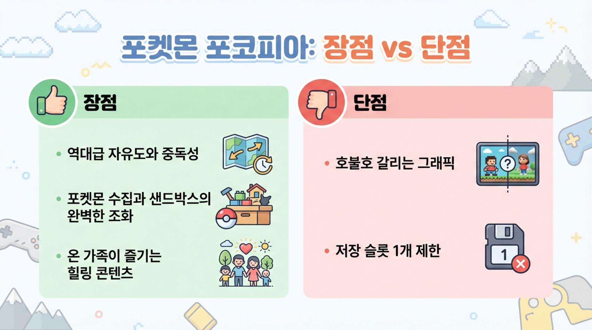 - 저장 슬롯 제한: 저장 데이터 슬롯이 하나뿐이라 여러 명의 가족이 함께 즐기기 어렵습니다.
