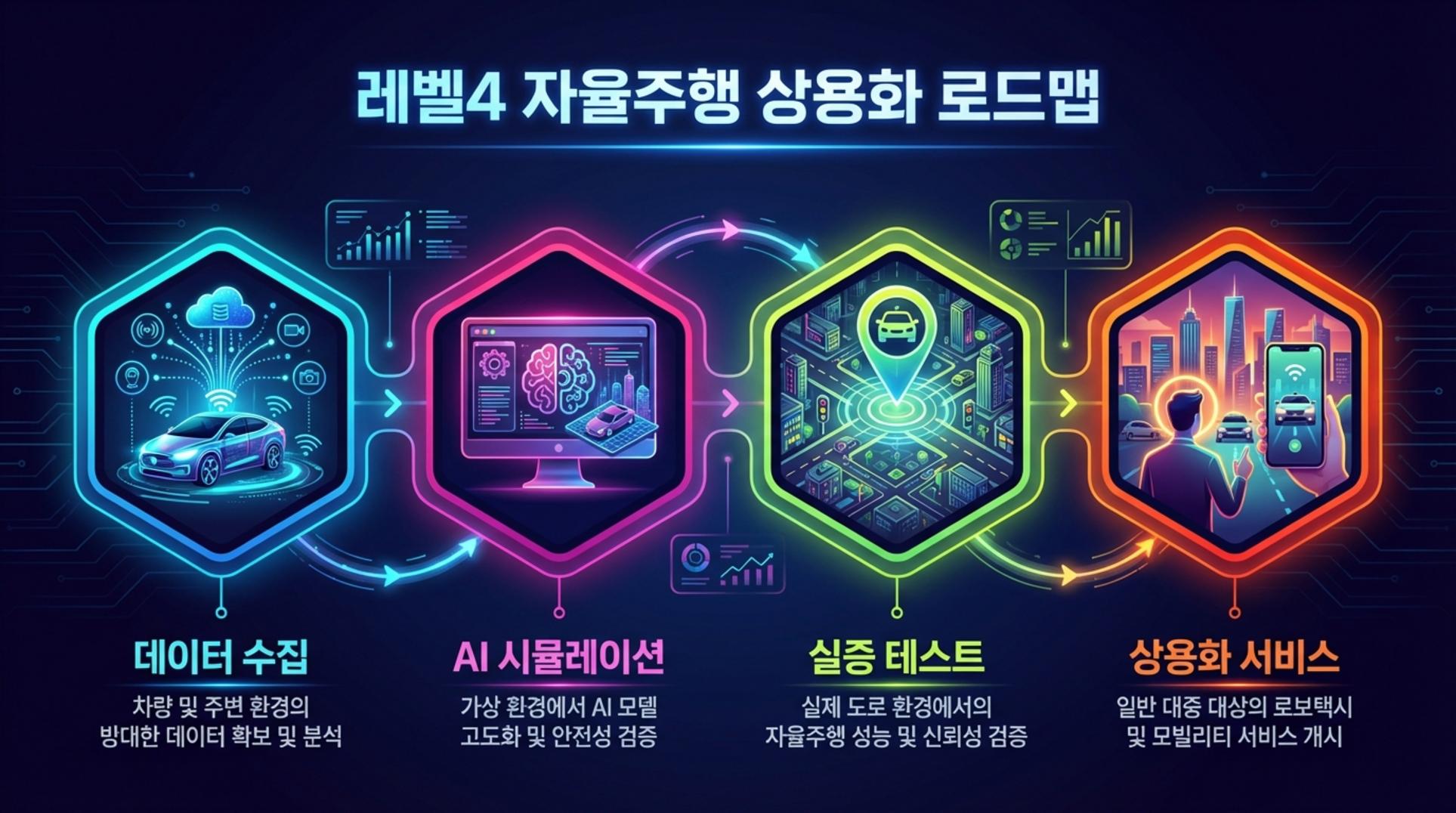 - 레벨4 자율주행: 지정된 구역 내에서 운전자 개입 없이 차량이 스스로 주행하는 단계로, 2027년 상용화가 목표입니다.