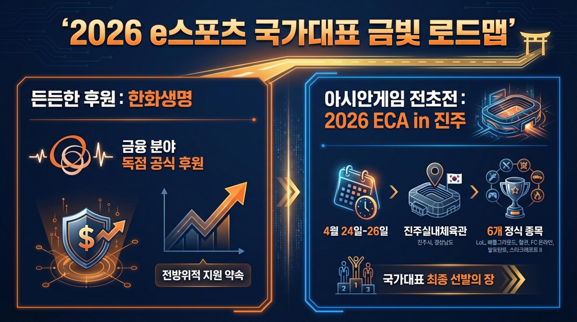 2026년 e스포츠 팬들의 심장을 뛰게 할 가장 큰 이벤트, 바로 '2026 아이치-나고야 아시안게임'이 다가오고 있습니다. 대한민국 e스포츠 국가대표팀의 금빛 사냥을 향한 여정에 대한 기대감이 그 어느 때보다 뜨거운데요, 최근 팬들의 가슴을 더욱 웅장하게 만드는 두 가지 특급 소식이 연달아 전해졌습니다. 바로 든든한 동반자 '한화생명'의 공식 후원 소식과, 아시안게임의 향방을 가늠해볼 첫 시험대인 '2026 아시아 이스포츠 대회(ECA)'가 경남 진주에서 개최된다는 소식입니다.