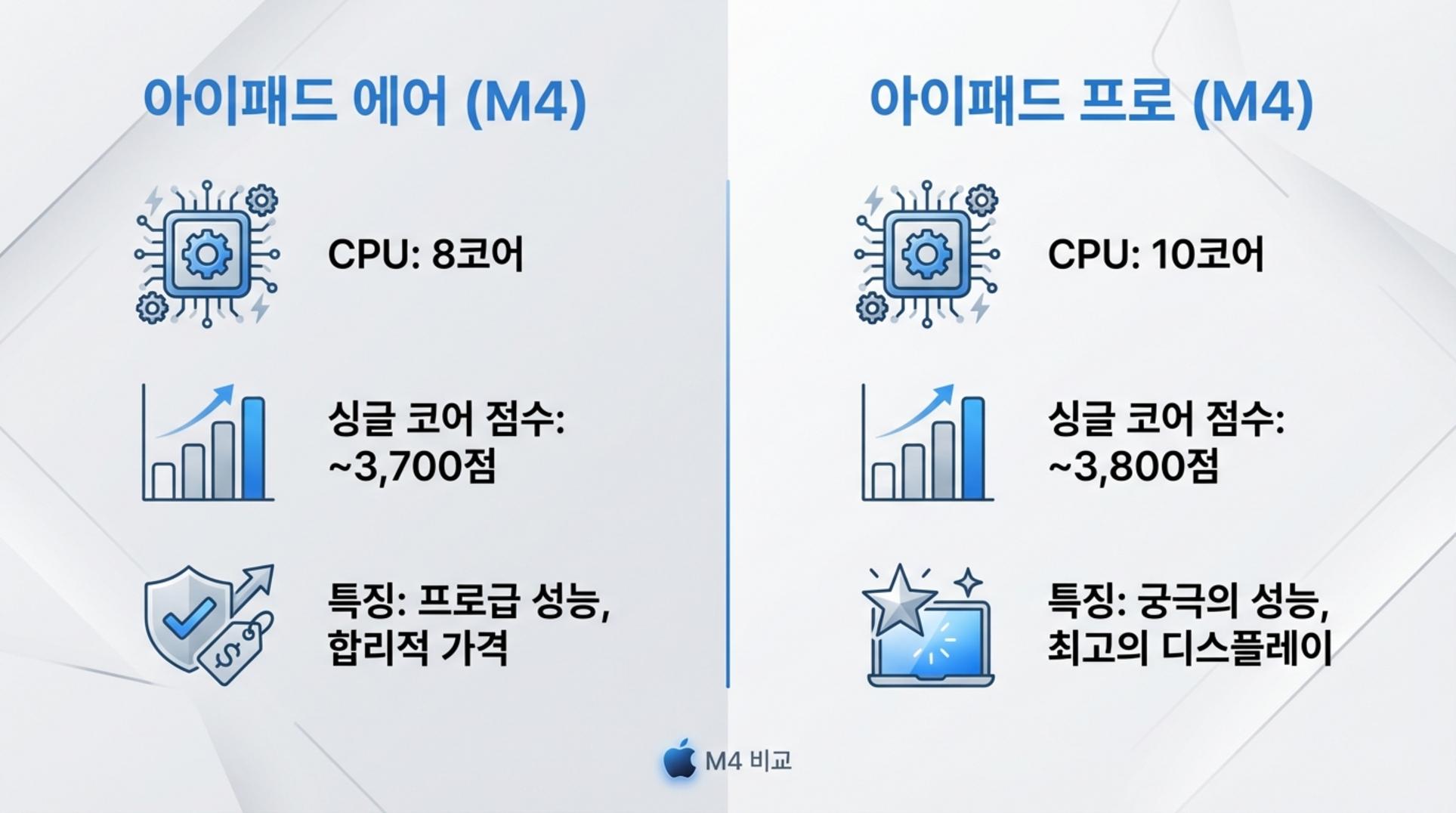 이번 신형 아이패드 에어의 가장 큰 핵심은 단연 'M4 칩셋' 탑재입니다. 애플은 이전까지 에어와 프로 라인업에 탑재되는 칩셋에 명확한 급 차이를 두어왔는데요. 이번 M4 칩 탑재는 그 경계를 허무는 파격적인 행보로 평가받고 있습니다.
