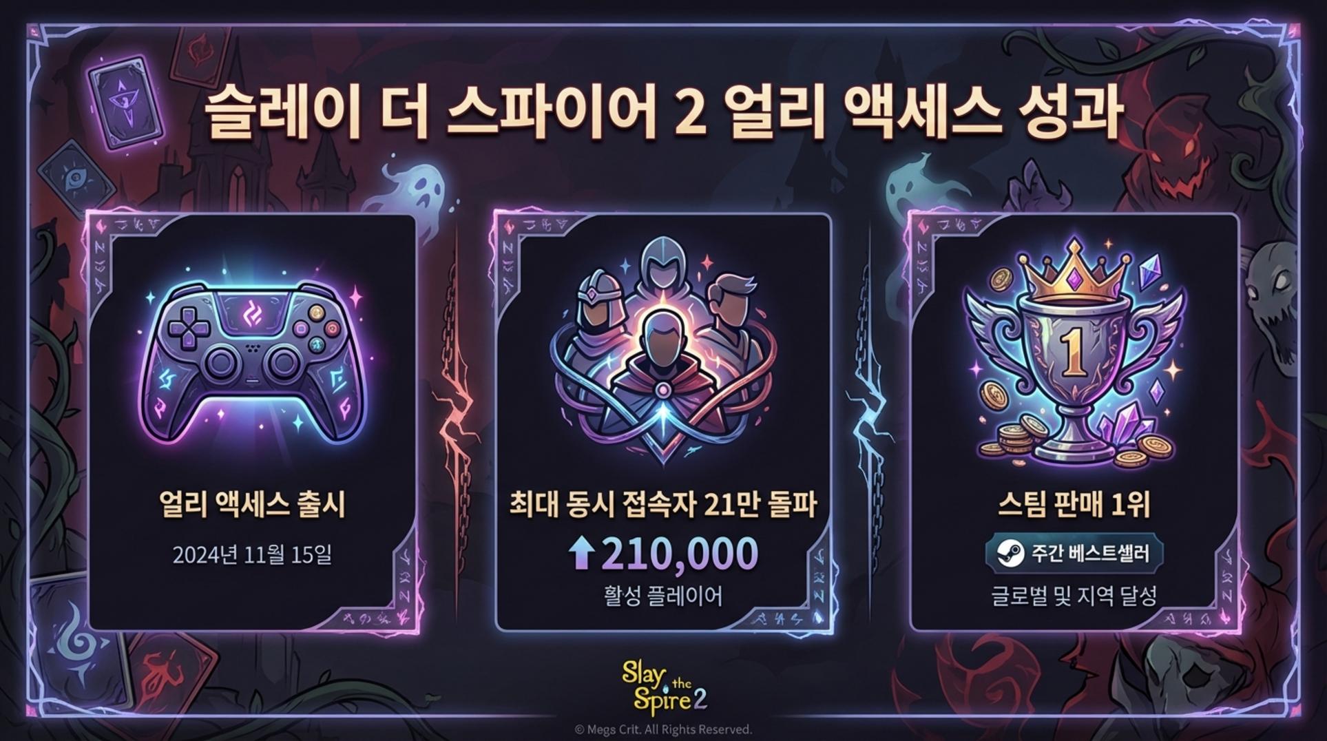 동시 접속자 21만 명이라는 수치는 2026년 출시된 모든 게임을 통틀어서도 최상위권에 해당하는 기록입니다. 이는 'Slay the Spire 2'가 단순히 '잘 만든 인디게임'을 넘어, 전체 게임 시장에 영향을 미칠 수 있는 잠재력을 가졌음을 증명하는 것입니다.