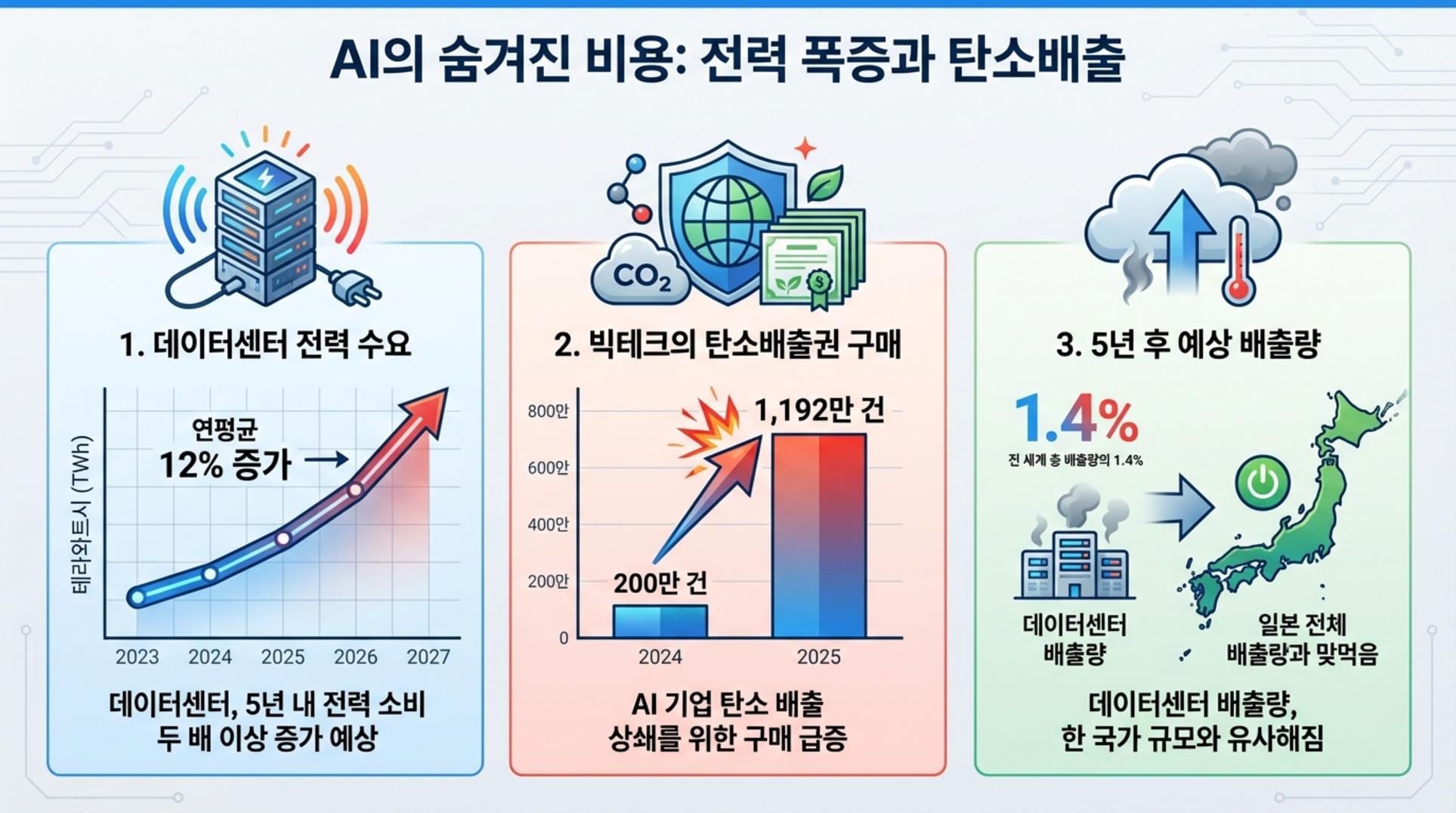 - AI 전력 수요 폭증: AI 기술 발전에 따라 데이터센터의 전력 소비가 기하급수적으로 늘어나며 일본의 연간 배출량에 맞먹는 심각한 환경 부담을 야기하고 있습니다.