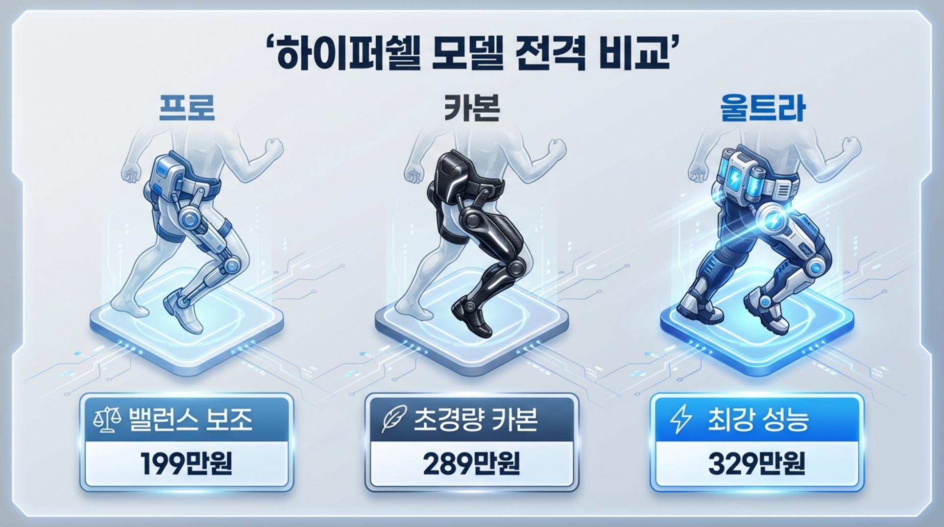 - 하이퍼쉘 프로 (199만원): 밸런스 보조 기능에 중점을 둔 기본 모델로, 일상생활에서 보행에 도움을 받고자 하는 분들에게 적합합니다.